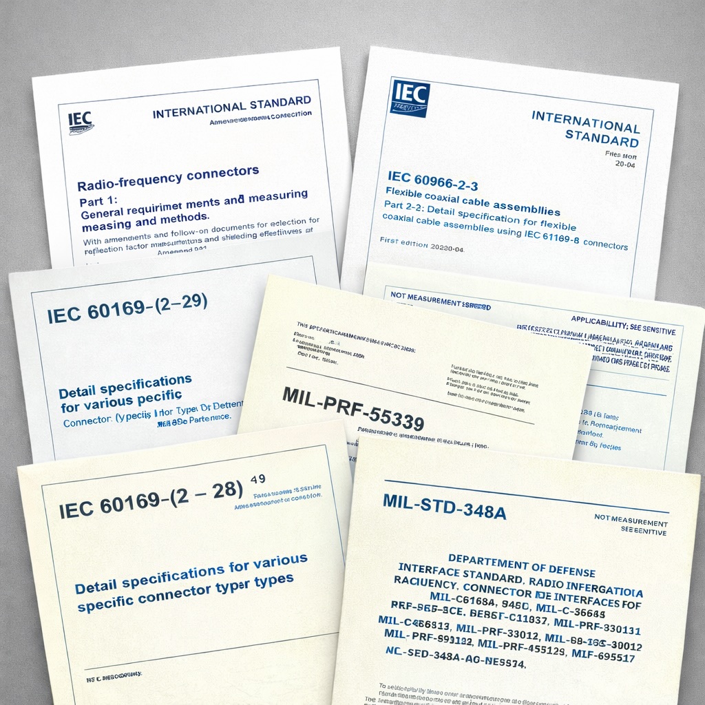 Одними з найважливіших стандартів є серія IEC 169‑xx, включаючи стандарти IEC 60169 та IEC 61169 для радіочастотних з’єднань. Також важливим для оборонної сфери є стандарт MIL‑STD‑348A (Міністерство оборони США) та інші стандарти, на які він посилається.