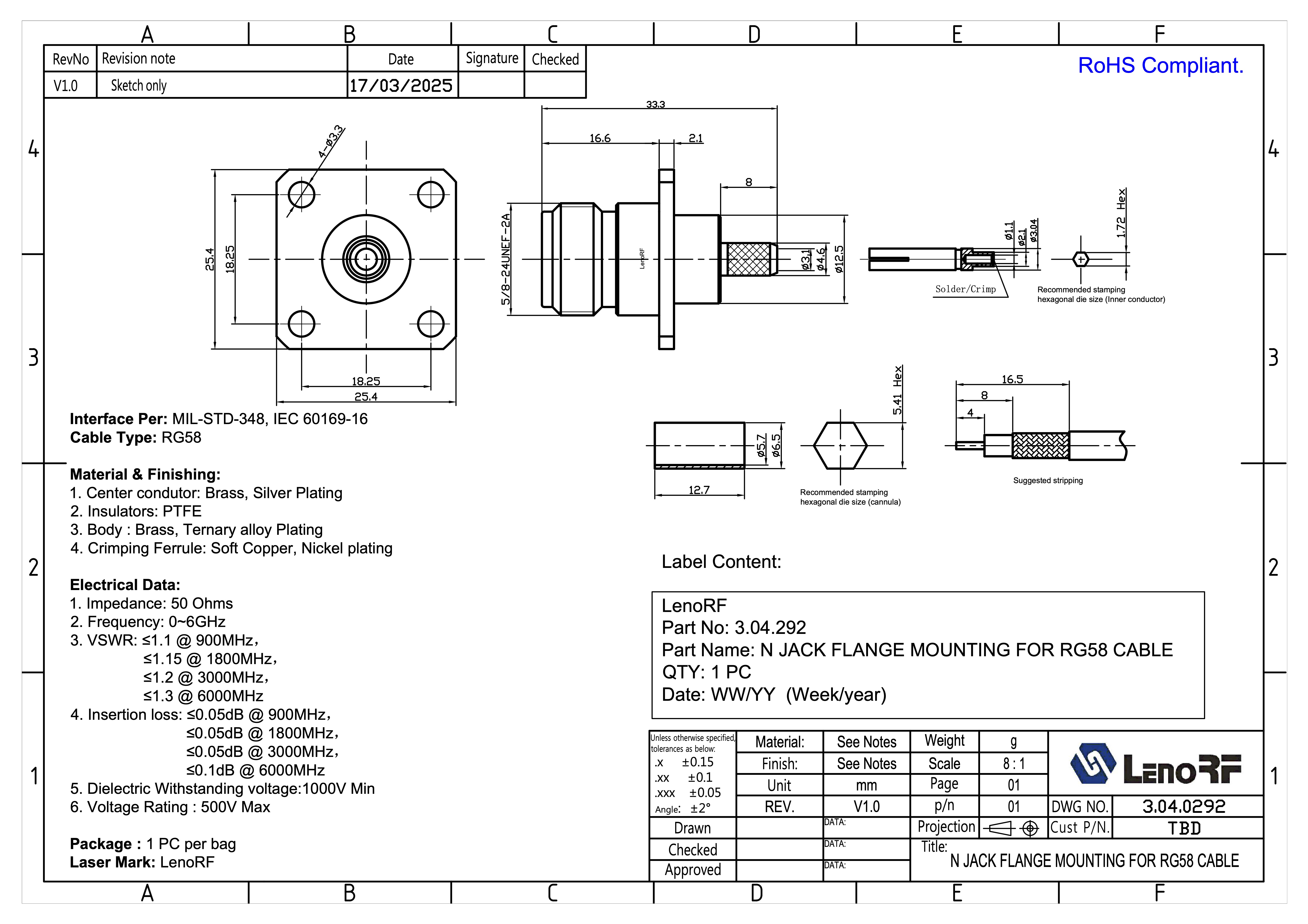 Відповідає стандартам: MIL-STD-348, IEC 60169-16