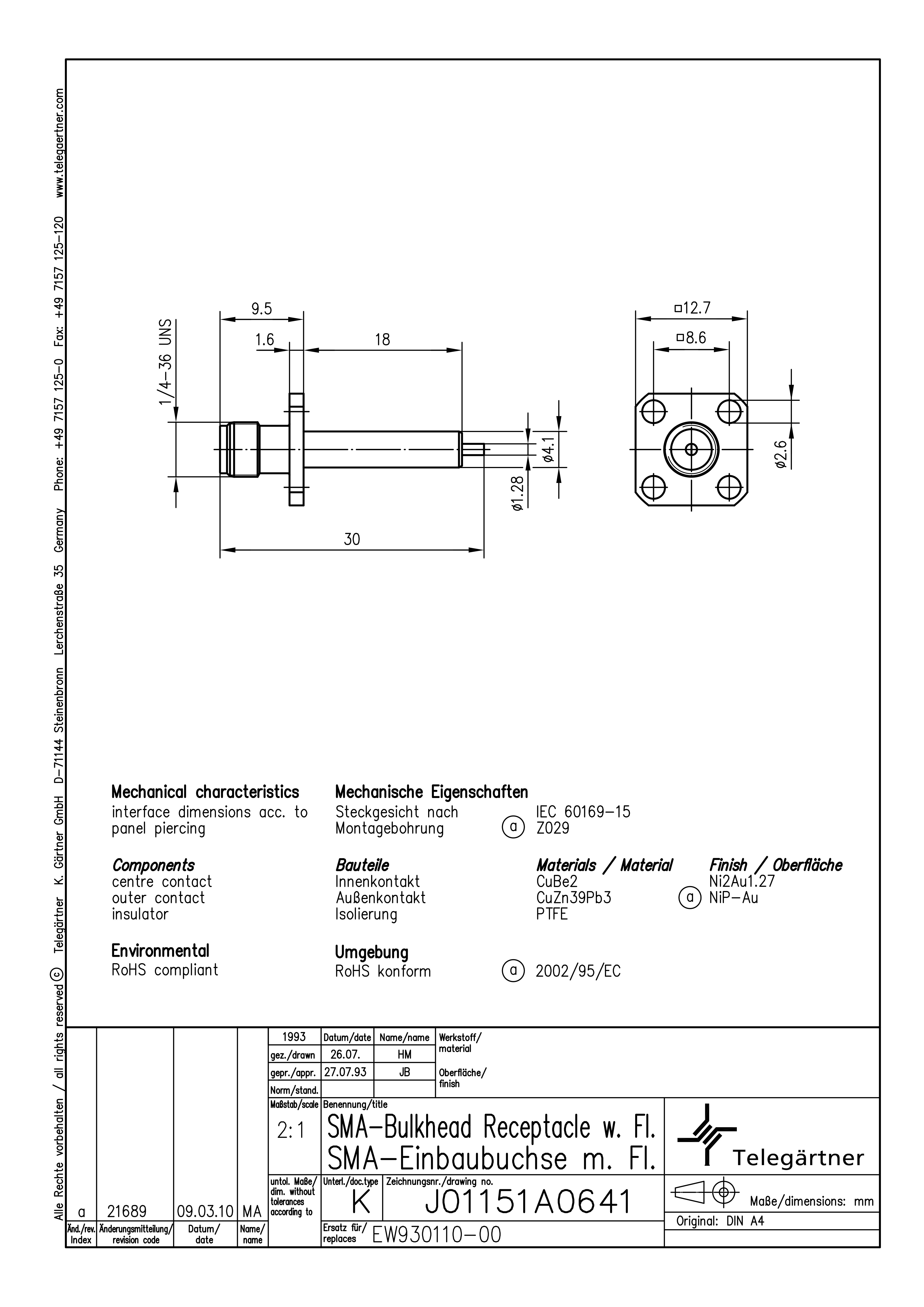 Роз'єм ВЧ SMA гніздо панельний з подовженим штирем для PCB J01151A0641