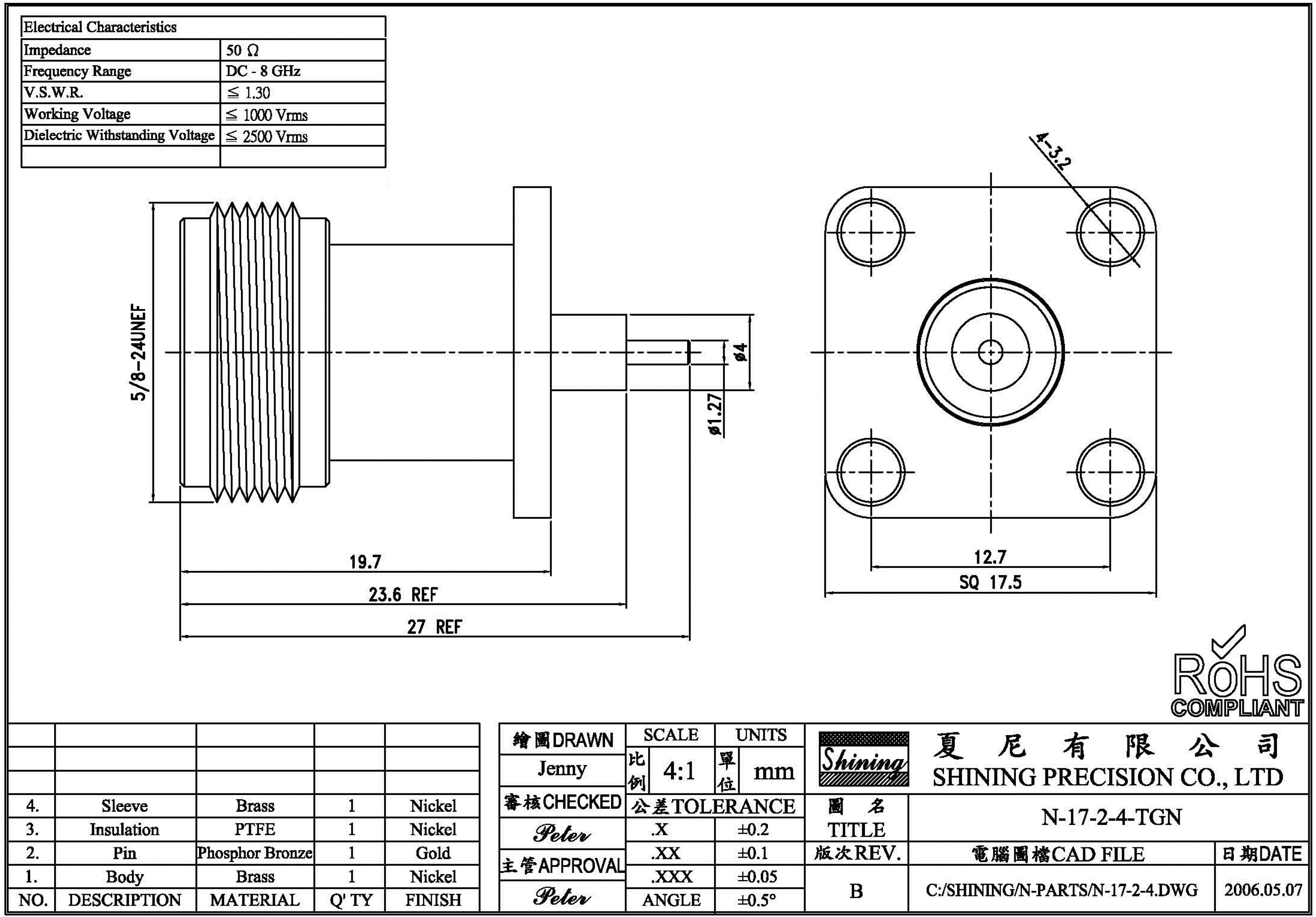 Роз'єм ВЧ N-female фланцевий, кріплення 4 гвинти, для PCB N-17-2-4-TGN.