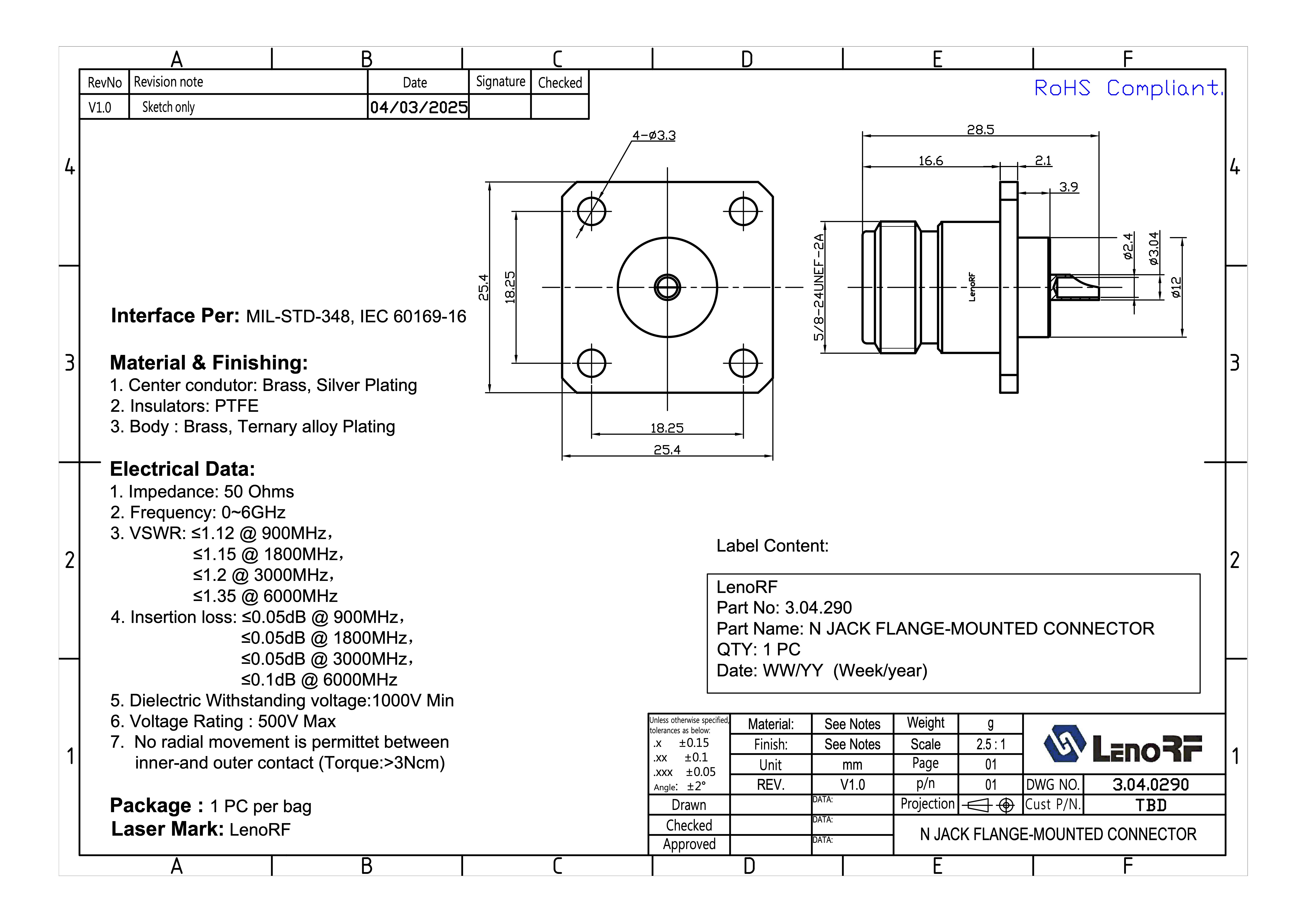 Коаксіальний роз’єм N JACK із фланцевим кріпленням призначений для надійного монтажу на панель у радіочастотних системах з робочою частотою до 6 ГГц. Відповідає міжнародним стандартам MIL-STD-348 та IEC 60169-16, що забезпечує сумісність із більшістю телекомунікаційного, вимірювального та РЧ-обладнання.
