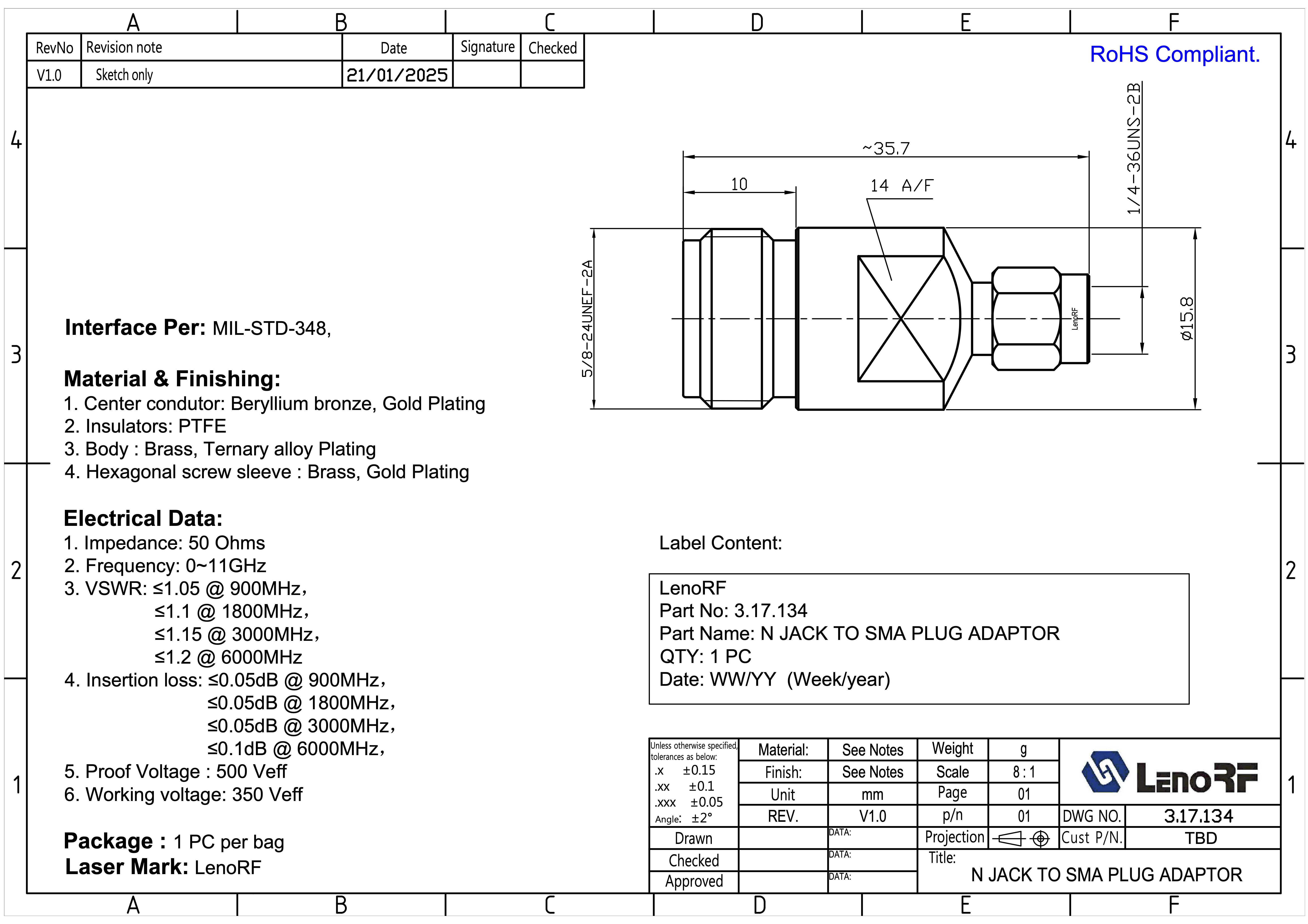Адаптер 3.17.134 забезпечує надійне з’єднання між роз’ємами типу N (гніздо) та SMA (штекер). Він призначений для високочастотних застосувань, де потрібна стабільність сигналу, низький рівень втрат та висока узгодженість імпедансу. Виріб відповідає стандарту MIL-STD-348 і виготовлений з високоякісних матеріалів із прецизійною обробкою.