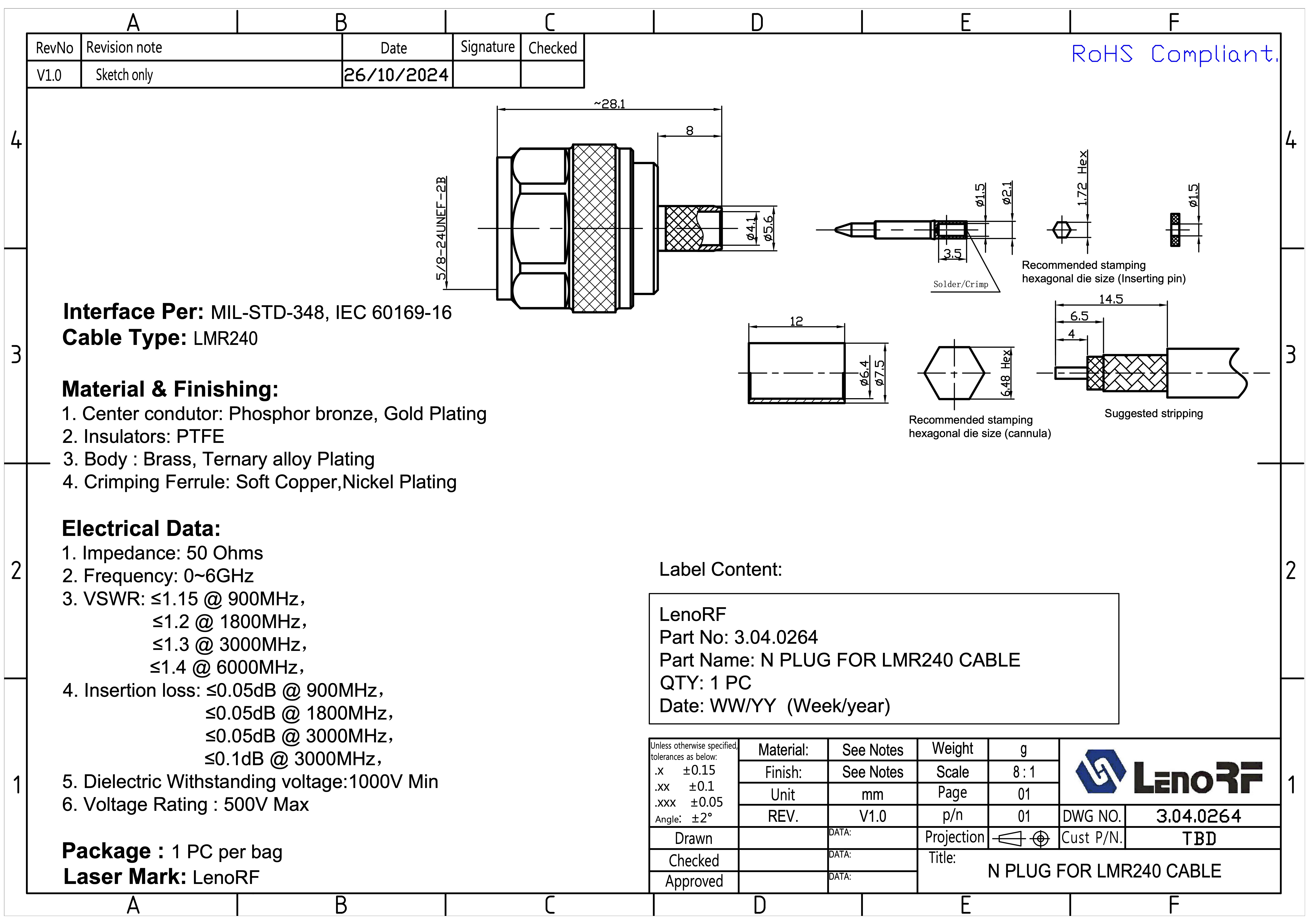 Роз'єм N-male 3.04.0264 50 Ом для коаксіальних кабелів LMR-240, SLL-240, KSR240, H155. Діапазон частот: 0-6 ГГц.
