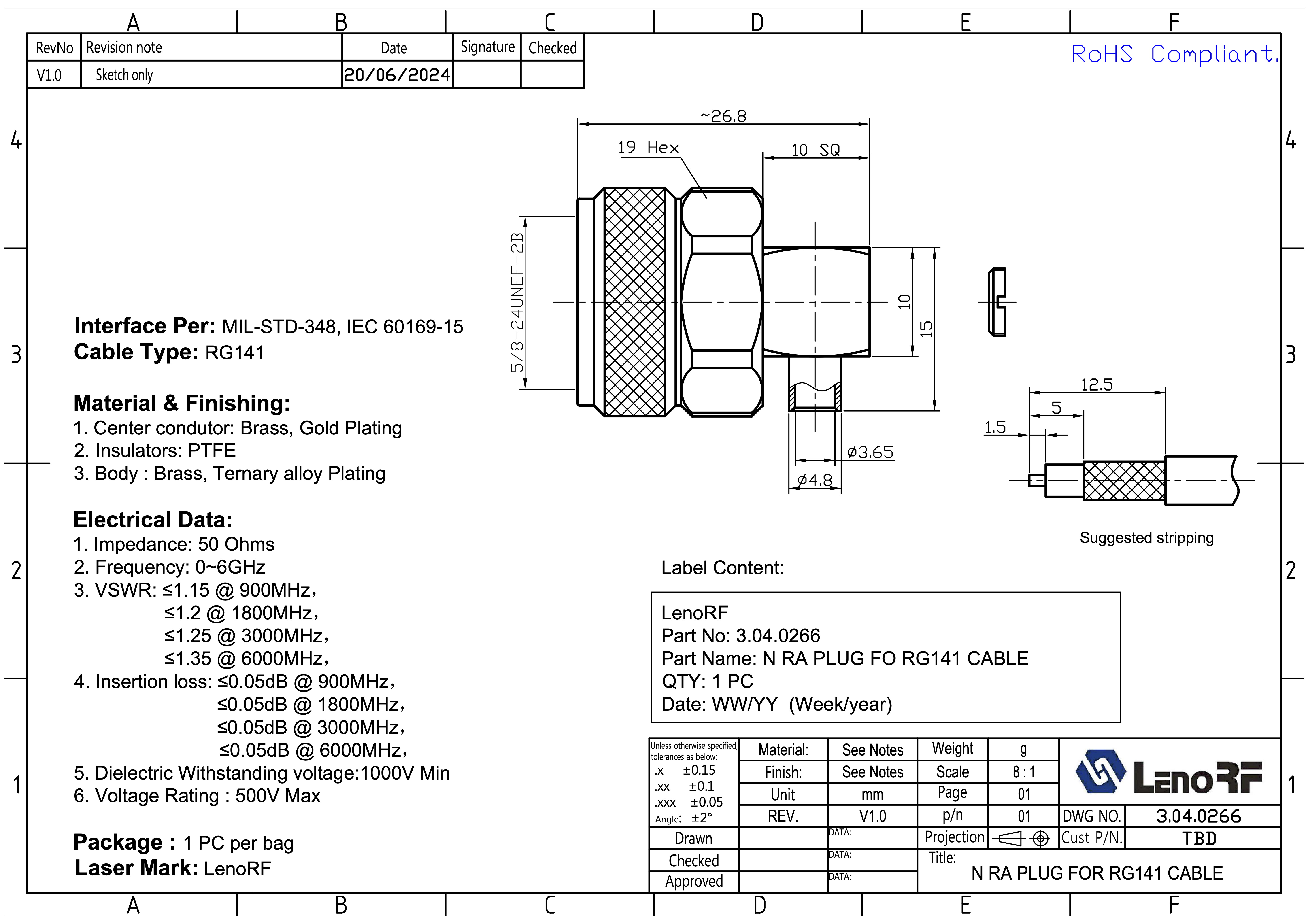 Роз'єм ВЧ N-male кутовий RG-402, SSF-141, Flexiform 402, Kingsignal 670-141SXE, паяння/обтискання 3.04.0266.