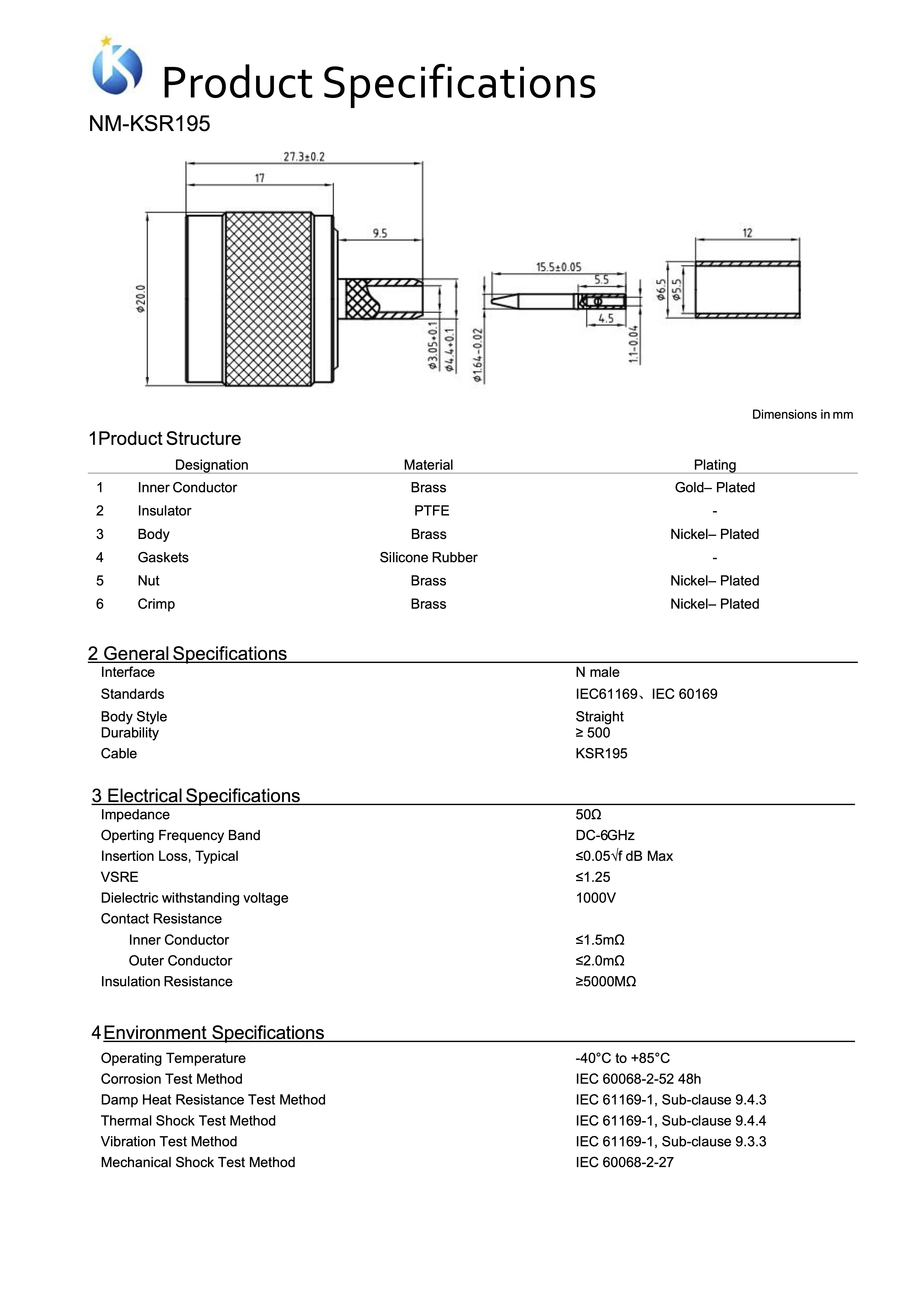 Роз'єм N-male NM-KSR195 / Для коаксіальних кабелів (RG-58C/U); RG-141A/U, RG-58C/U, 7806A, 9907, CNT-195, HPF 195, KX 15, LMR-195, WCX195, 1.0/2.95 AF, RG-141A/U / Діапазон частот: 0-6 ГГц