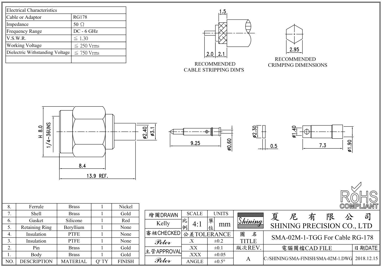 Роз'єм ВЧ SMA-male для кабеля RG-178, паяння/паяння SMA-02M-1-TGG.
