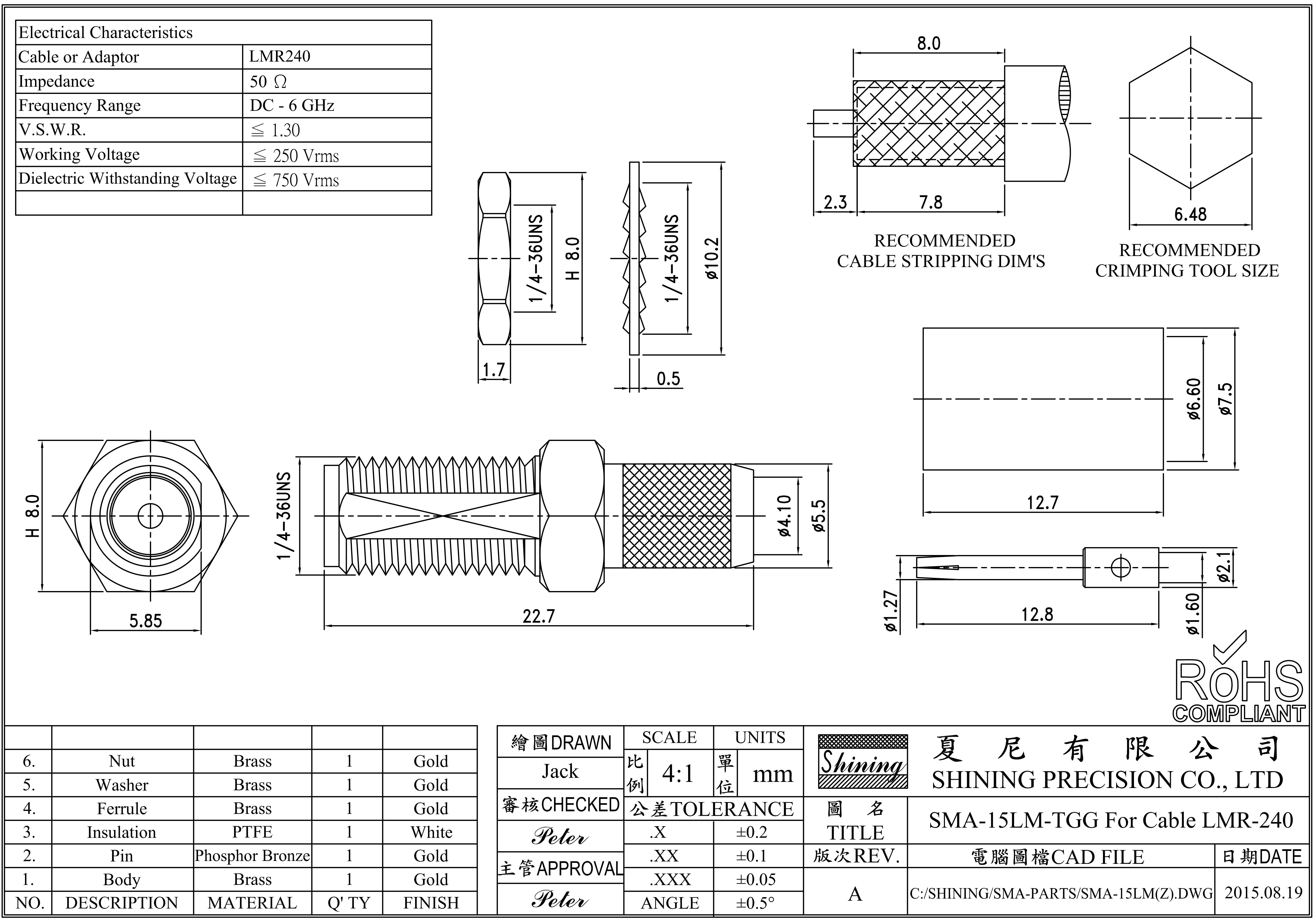 Роз'єм ВЧ SMA-female bulkhead (KSR240, LMR-240, SLL-240, H155, M&P 5/.212"), паяння/обтиск SMA-15LM-TGG.