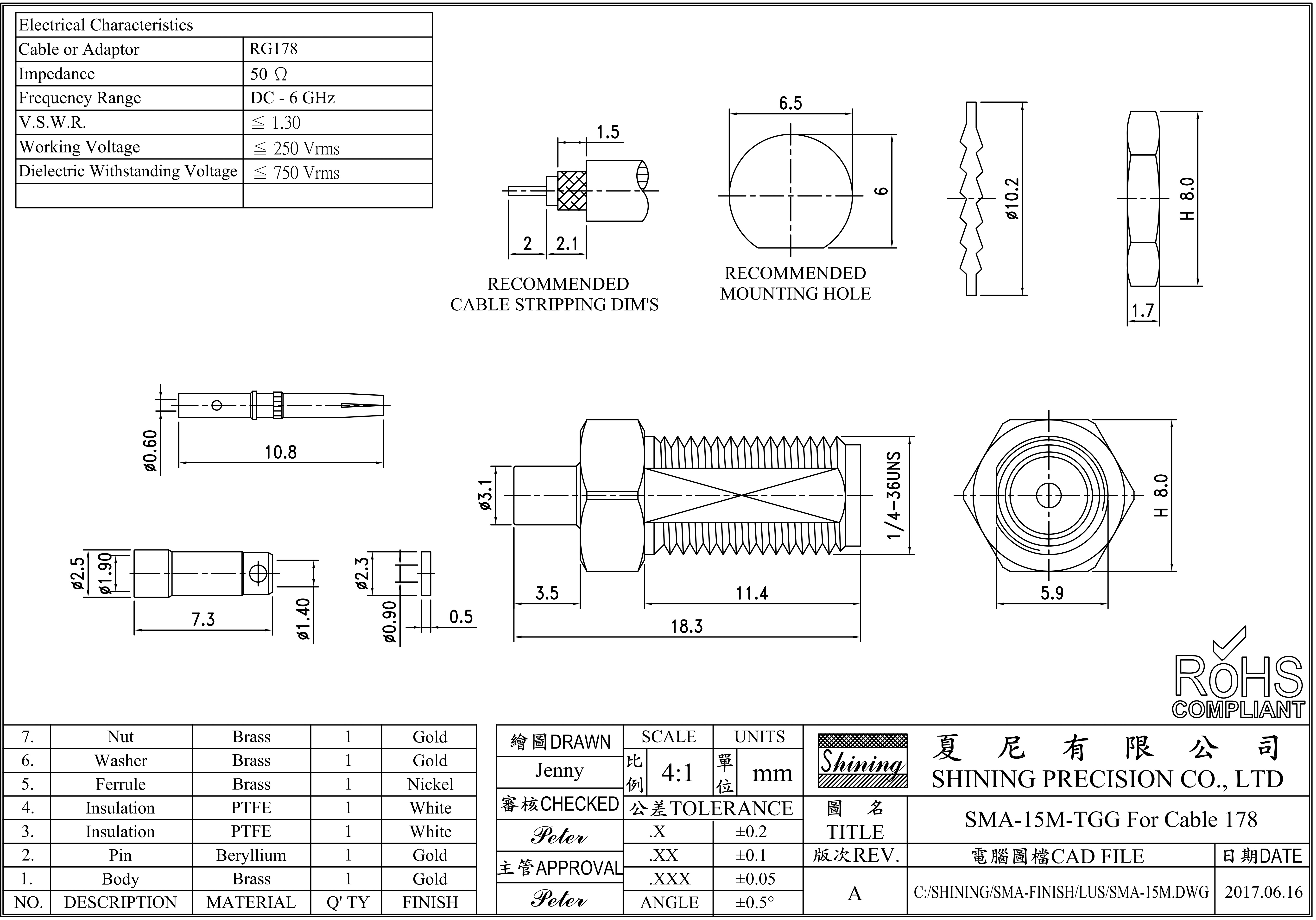 Роз'єм ВЧ SMA-female bulkhead для кабеля RG-178, паяння/паяння SMA-15M-TGG