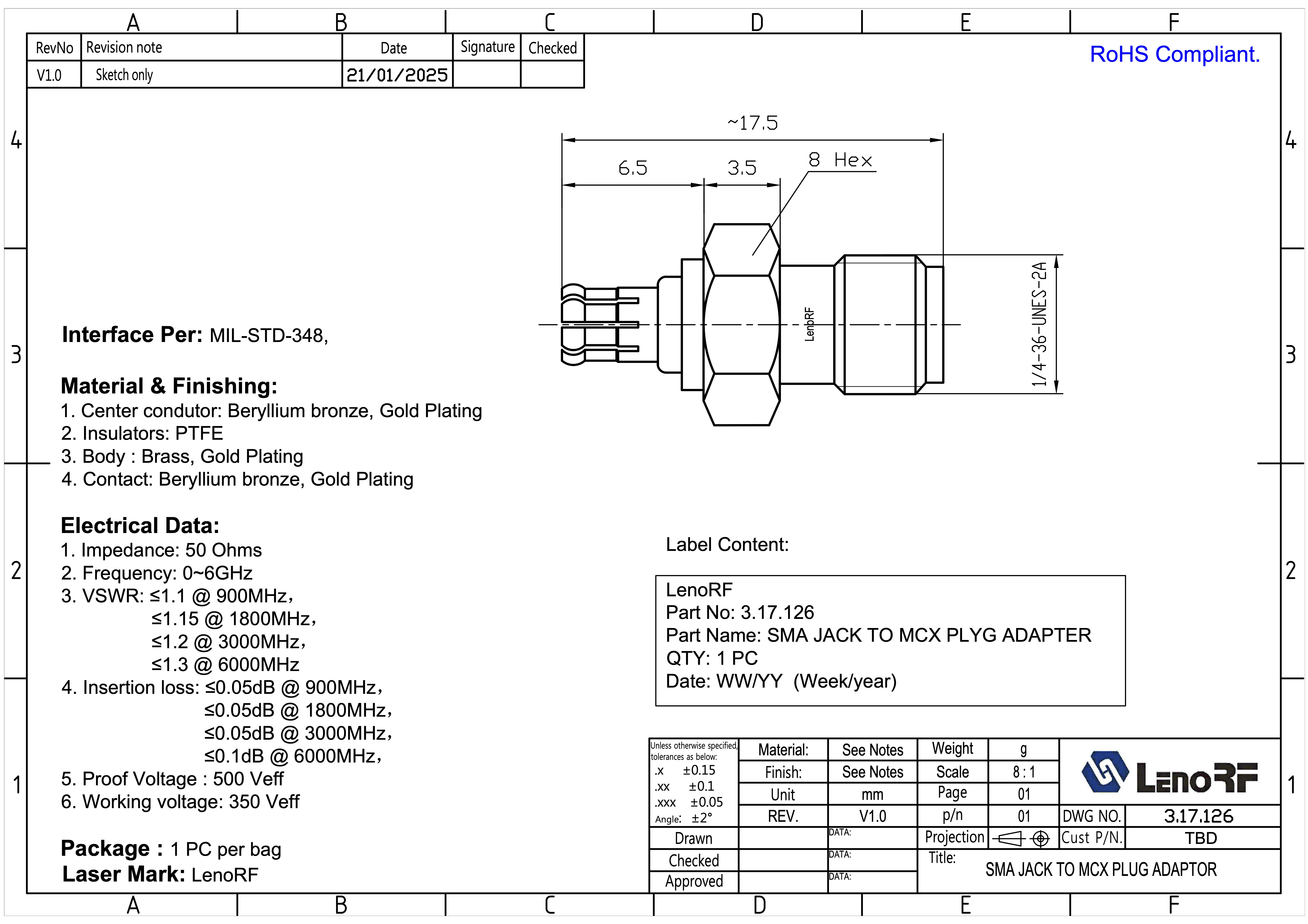 Адаптер SMA Jack to MCX Plug призначений для з’єднання пристроїв та кабелів із роз’ємами типу SMA (гніздо)та MCX (штекер). Забезпечує узгодження імпедансу 50 Ом, низькі втрати сигналу та стабільну роботу в широкому частотному діапазоні до 6 ГГц. Виготовлений відповідно до вимог MIL-STD-348, що гарантує сумісність та надійність з’єднання.