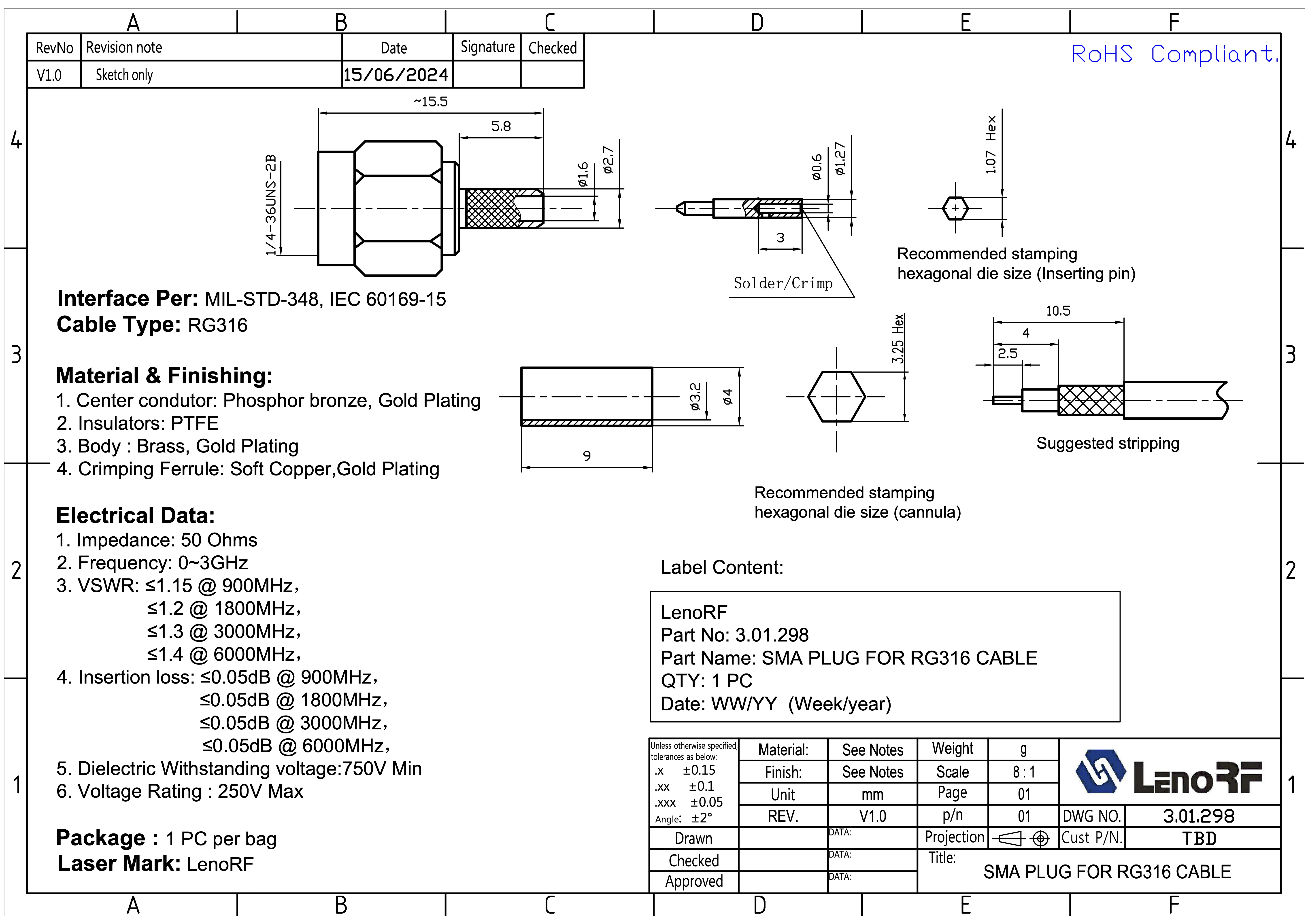 Роз'єм ВЧ SMA-male для кабелів (RG-316, RG-174), паяння/обтиск 3.01.298.